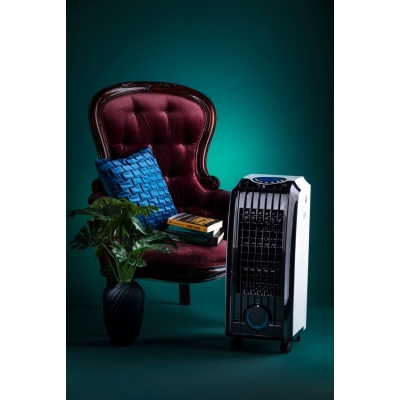 Klimator wyposażony jest w wygodny uchwyt do przenoszenia urządzenia (z obu stron), uchwyt na przewód zasilający, kółka ułatwiające przesuwanie po każdej powierzchni oraz siatkę filtrującej o wysokiej jakości wykonania. W zestawie znajdują się też dwa elementy chłodzące, które po włożeniu do zbiornika z wodą pozwolą na szybkie schłodzenie powietrza. Intuicyjny panel sterowania ułatwia wybór odpowiedniego trybu pracy. Wystarczy wcisnąć przycisk HUMIDIFY, aby obniżyć temperaturę wydmuchiwanego powietrza poprzez uruchomienie pompy wody. Klimator wyposażony jest także w timer, który pozwala zaprogramować ile czasu będzie pracowało urządzenie, zanim samo się wyłączy (od 0.5h do 7.5h). Do zestawu dołączony jest także pilot na 2 baterie (AAA).