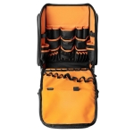 Plecak elektryka 31 elementów 01-313 marki NEO TOOLS to kompletny zestaw narzędzi składający się z 31 elementów. Plecak ma pojemność 20 litrów i jest wyposażony w 7 zewnętrznych kieszeni oraz 19 wewnętrznych kieszeni, co zapewnia wygodne przenoszenie i organizację narzędzi. Wykonany jest z wytrzymałego materiału polyester 600D. Jego wymiary to: szerokość – 370 mm, głębokość – 275 mm, i wysokość – 515 mm. Dodatkowo, plecak posiada gumowaną podstawę oraz sztywną ramę. W skład zestawu wchodzą narzędzia wykonane z wysokiej jakości materiałów, takie jak narzędzia z materiału CrV z dwukomponentowym uchwytem: szczypce uniwersalne izolowane (180 mm), szczypce boczne izolowane (160 mm), szczypce wydłużone proste izolowane (200 mm), szczypce wydłużone wygięte izolowane (200 mm), szczypce do ściągania izolacji izolowane (160 mm), oraz szczypce boczne izolowane (180 mm). Znajdują się tu także wkrętaki z materiału S2 z dwukomponentowym uchwytem w tym krzyżowe izolowane (PH0 x 60 mm, PH1 x 80 mm, PH2 x 100 mm, PH3