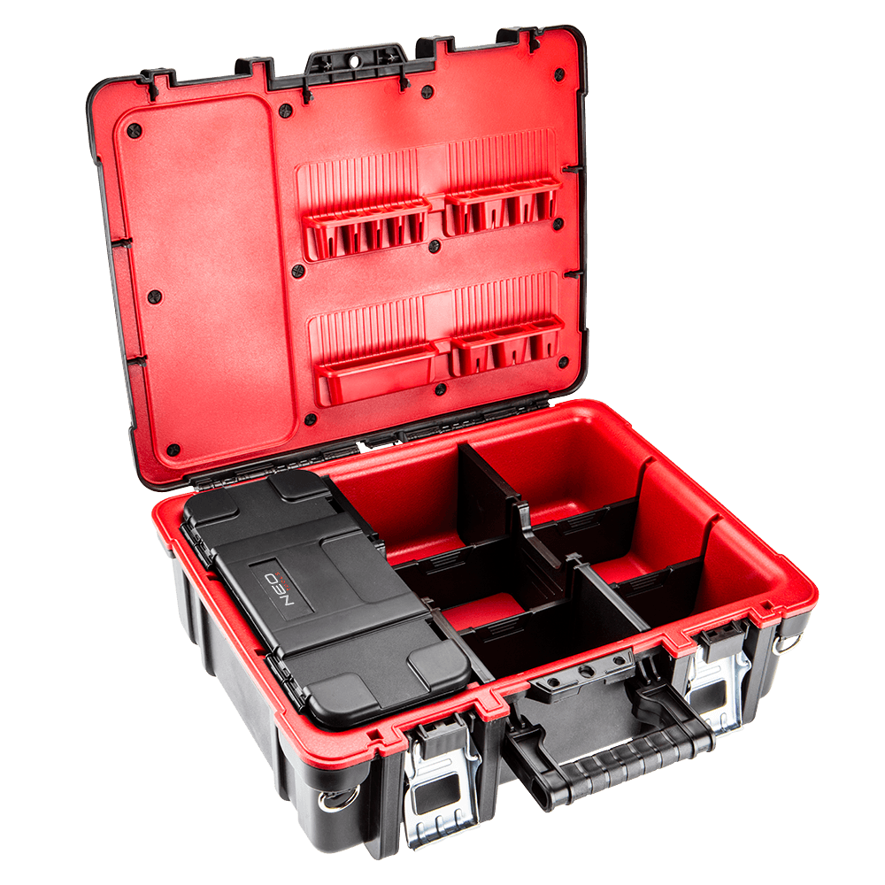 Walizka narzędziowa NEO o wymiarach 48 x 38 x 17.8 cm. Praktyczna i solidna skrzynka narzędziowa wykonana z wytrzymałego tworzywa sztucznego z aluminiowymi zapięciami. Skrzynka posiada 1 dodatkowy wyjmowany organizery do przechowywania drobnych elementów oraz wyjmowane ścianki.