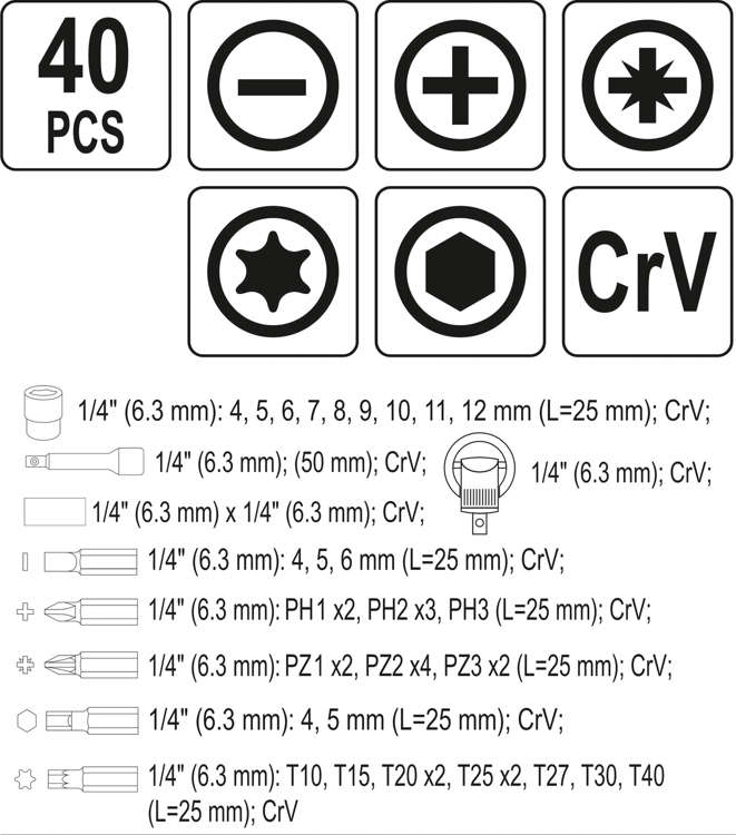 Zestaw 40 precyzyjnych elementów przeznaczonych do odkręcania wkrętów i śrub w trudno dostępnych miejscach.